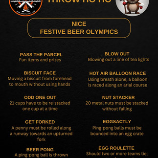 Like a Christmas Party but properly fun! Axe throwing, food & nibbles*, followed by Festive Beer Olympics (alternative "cheeky" version available for sole use bookings only) then onto the dancefloor! *Options available for those with Allergies, Intolerances plus Vegetarian or Vegan